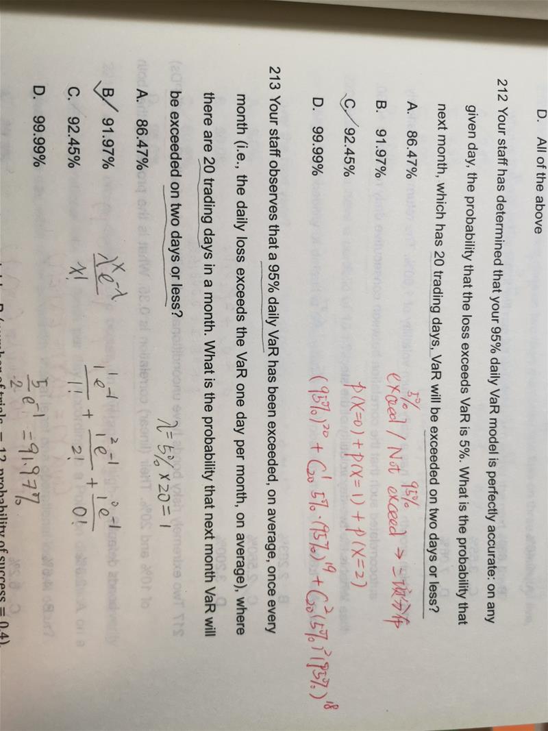 老师好,我在做这两题时,都用了泊松分布计算,因为第一题读到exceed概率5%和20个交易日,我就天然得出20天内平均会有1天exceed,继而用泊松分布计算。但是答案是第一题二项,第二题泊松,请问是如何判断出来的呢,有什么地方使题一不能用泊松?
