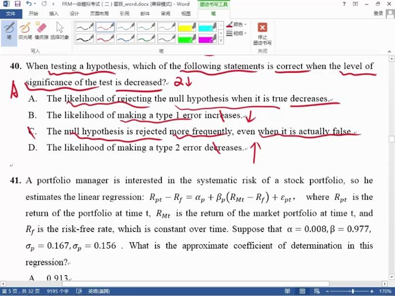 模考2的40题C选项为什么不正确呀? α和power of test相加=1吗?(即两者间有此消彼长的关系) confidence level和error2 有此消彼长的关系吗? 视频中老师说power of test+error2=1,那么error1+confidence level之和也等于1吗