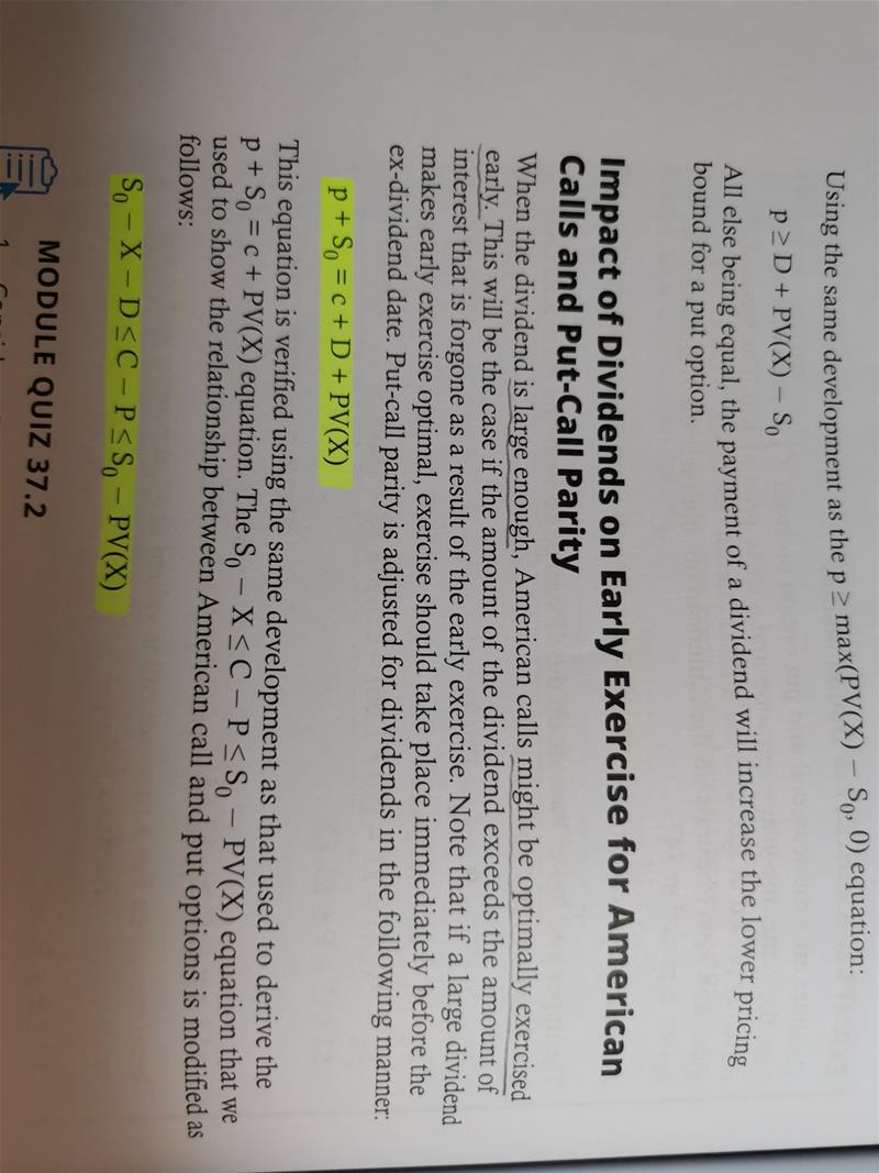 老师好,关于美式期权不等式,如果不考虑dividends,是S-K<=c-p<=S-PV(K).考虑dividends后,从NOTES教材看,不等式左边再减去D,但是右边却不再减PV(D)是什么原因呢?