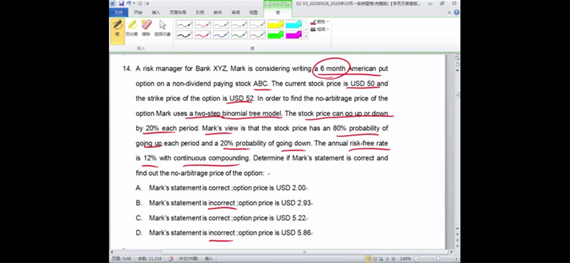 第14题解题过程中用到上涨20%,所以股价分别为60和40,然后一步步求期货价格。但是为啥答案又说它错的。这里的概率是什么意思