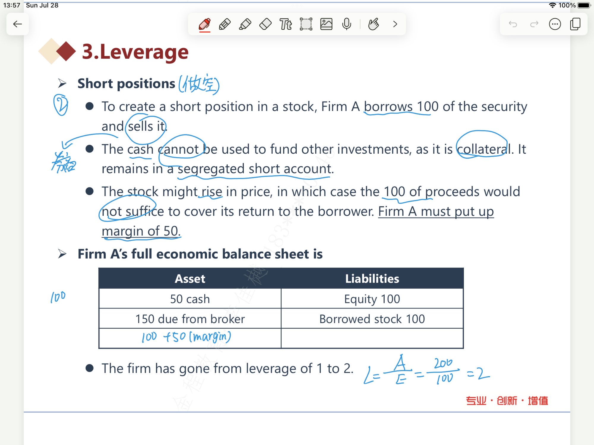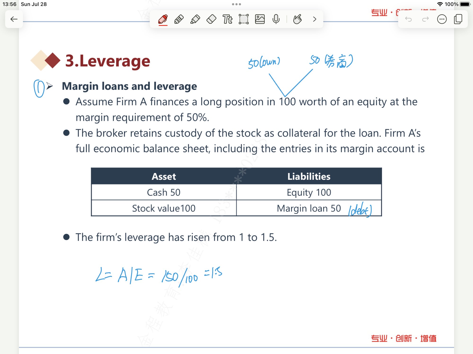 另外这一页前面也有交代是一开始cash100, Equity100.现在表格中cash变成50了,说明只用了50的cash买的Equity,那还有50就是借的