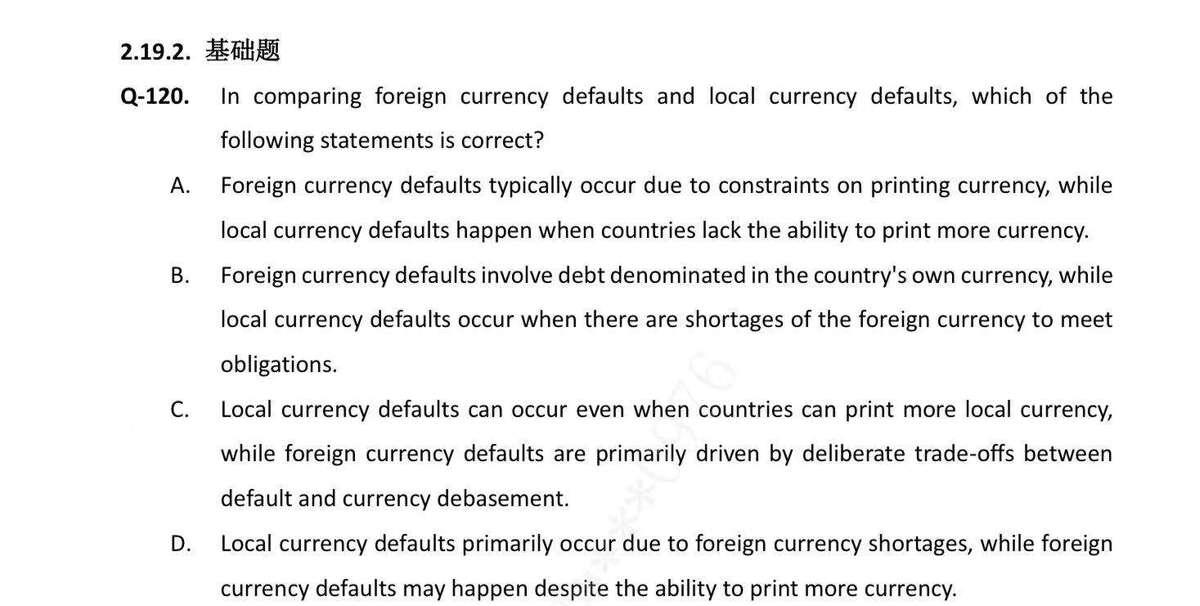 网校上这道题的A选项是:Foreign currency defaults often occur due to military conflicts or weak institutional structures, while local currency defaults are primarily triggered by economic recessions and political instability. 意思是外币违约往往是由于军事冲突或体制结构薄弱造成的,而本币违约主要是由经济衰退和政治不稳定引发的。这句话只能说部分准确,历史上的外币债务违约确实常见于军事冲突、政变等事件,尤其在拉美国家的违约案例中,军事冲突和制度薄弱是主要诱因。而本币债务违约则更复杂。原版书提到的触发因素包括:经济衰退,政治不稳定,对货币印钞能力的限制(如金本位、共享货币制度),以及国家可能会选择不印钞以避免通货膨胀和货币贬值。