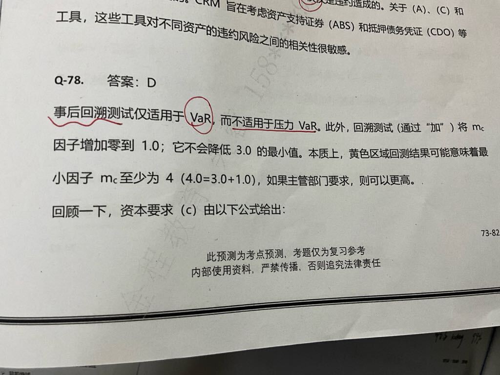 D的意思是说回测这个事情SVaR是做不来的,因为SVaR这个数据不是从真实的损失数据得来,而是模拟的数据。而回测是用历史真实的数据来检测,所以SVaR这个指标也就不合适了。这也是这个选项错误的一个原因。