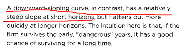 同学你好,根据书中的描述,其实我们可以这么理解,1年期,3年期,5年期的spread是越来越小的,说明这个曲线是downward sloping的,并且前期的spread比较大,后期的spread比较小,因此前期公司是比较危险的,更加容易违约,它的spread curve在前期也是更加陡峭的,到了后期,如果公司还没有违约的话,也就是说最艰难的时期已经渡过了,那么它的spread curve会变得相对平缓的