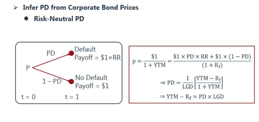 第一个问题:PD*(1-RR)=credit spread,这个公式老师是在课堂上有给大家推过的,我把对应的讲义截图截给你看看呀。请看下面的图片,化简一个就能得到这个等式了