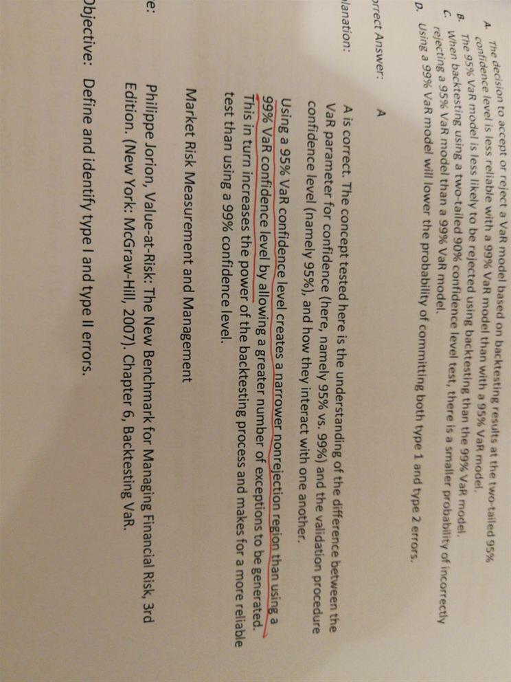 B选项:在A中我们已经解释过,95%的VaR值在回测的过程中更容易被找到exception,因此他也更容易被拒绝,而99%的VaR可能极端到根本找不到exception,因此B错在了less。