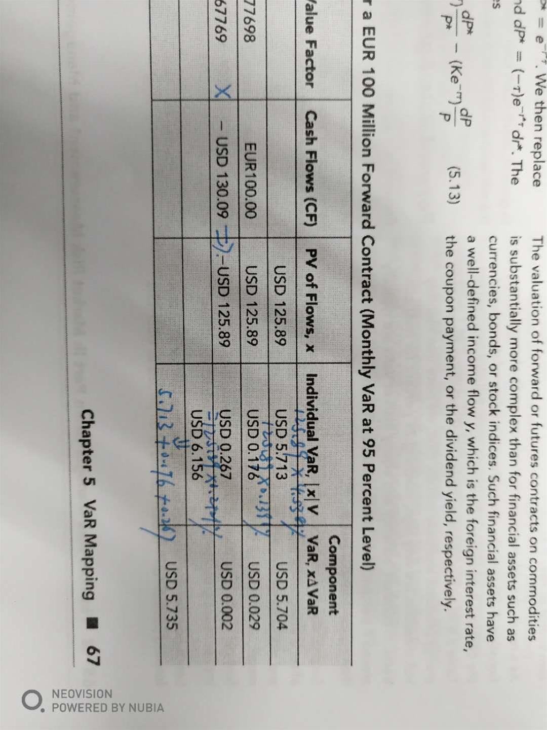 老师把计算过程写下来的,你可以看一下,比如,第三列的125.89.是用前面的130.09与折现因子0.967769相乘得到的,后面的VaR,就需要借助另外一张表格里的信息了,对应的,老师把表格也拍给你啦。主要会用到的就是我圈出来的那一列的数字,这一列的数字都是VaR(%)的概念。后面的VaR是dollar VAR,计算运用的公式就是VAR=cash flow*VaR(%),