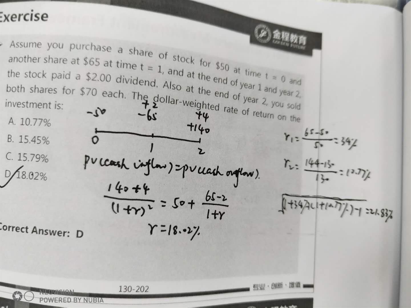 对time-weighted rate of return还是不太理解,exercise 2里面在t0 和t1分别通过50 (a)和65 (b)买入相同的stock共计两个share,a是在t0时候买入的并且在t1的时候价值上升为65再加上额外的2 dividend, return是34%但是这只股票并没有卖出啊,到t2的时候这一只股的价值成为了70再加上额外的dividend,return是26%(不是ppt中的10.77%),以上是a的价值。b在t1时候购入并且到t2的时候跟a从t1到t2阶段一样。这里就有一个问题了,a和b在股票增值的价值上有重合的部分,为什么重合的部分只算一次的return呢?还有就是ppt中所求r2的式子,我算了多遍都不是10.77%