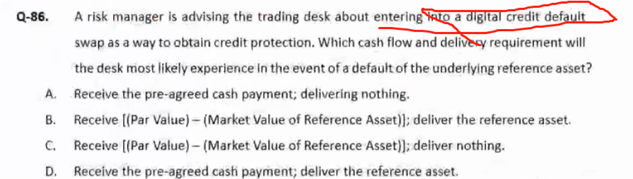 同学你好,因为这道题明确说了是一个digital CDS,对应的赔付方式是上面的第3种,所以应该选A