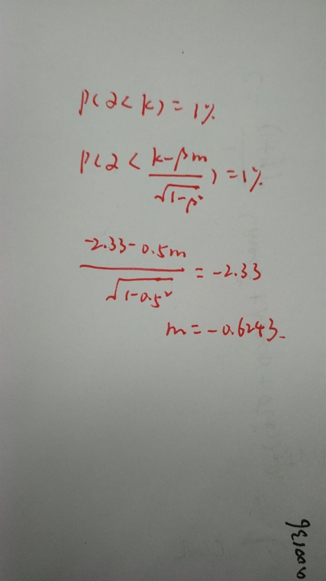 同学你好,这道题考查的是单因素模型,一个信用头寸与市场因子(市场因子是market factor)之间的相关性是0.5,也就是说beta值0.5,我们要算的是99%的置信水平下对应的市场因子是多少,既然是99%的置信水平,对应的违约概率就是1%,对应的正态分布的分为点就是-2.33,所以根据单因素模型的表达式,我们直接带入数据就可以算出市场因子m(realized market value)了,如下