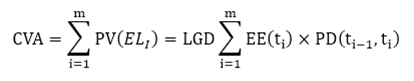 其中LGD是预计的违约损失率,EE(t_i )是每个关键时点的预期信用风险敞口,并且是现值形式的风险敞口,PD(t_(i-1),t_i )是每一段时间的违约概率的估计。