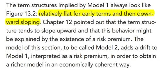 同学你好,模型一在非常短的期限内的利率期限结构是relatively flat,之后就是向下的,这里以原版书的内容为准。