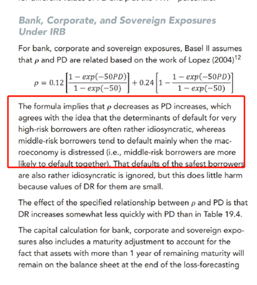 我明白了,还是我上面说的,图二的公式是巴塞尔协会规定的,我之前觉得,虽然公式是协会规定好的,但是算出来的相关系数会根据PD的变化而变化,所以我觉得相关系数在某种层度上也算是银行决定的;但解析的意思是,既然公式是巴塞尔协会规定的,那么相关系数就不能算是银行自己定的。
