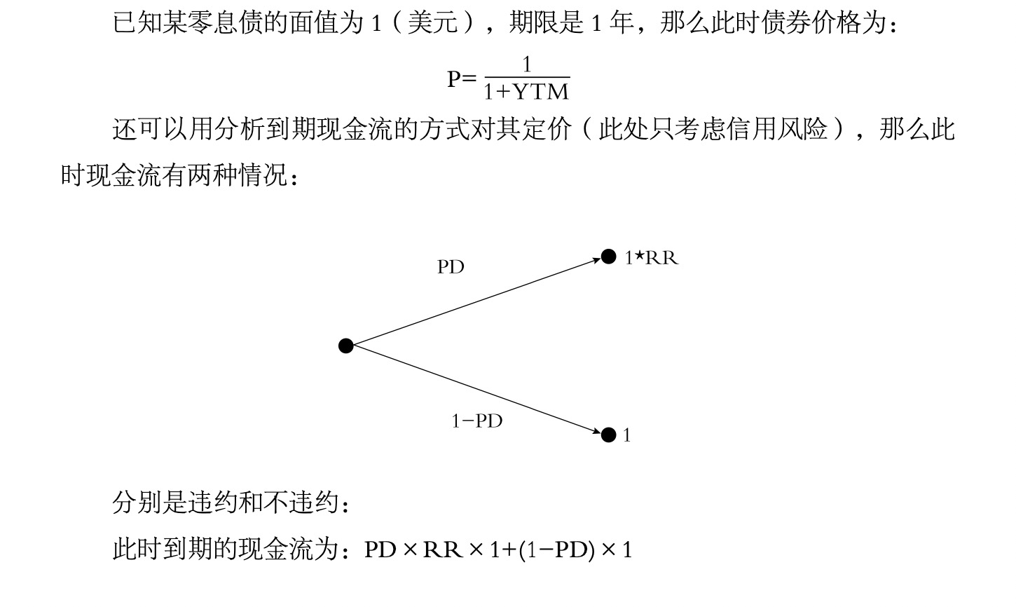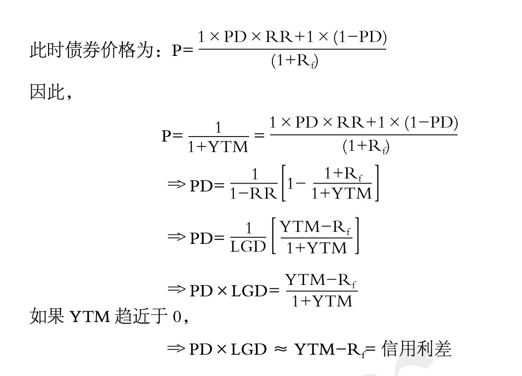 YTM-Rf=PD×LGD这个公式完整的推导见附图。这个公式其实只是近似式,前提是要YTM接近于0,这里算出的YTM为20%,已经远大于0了。
