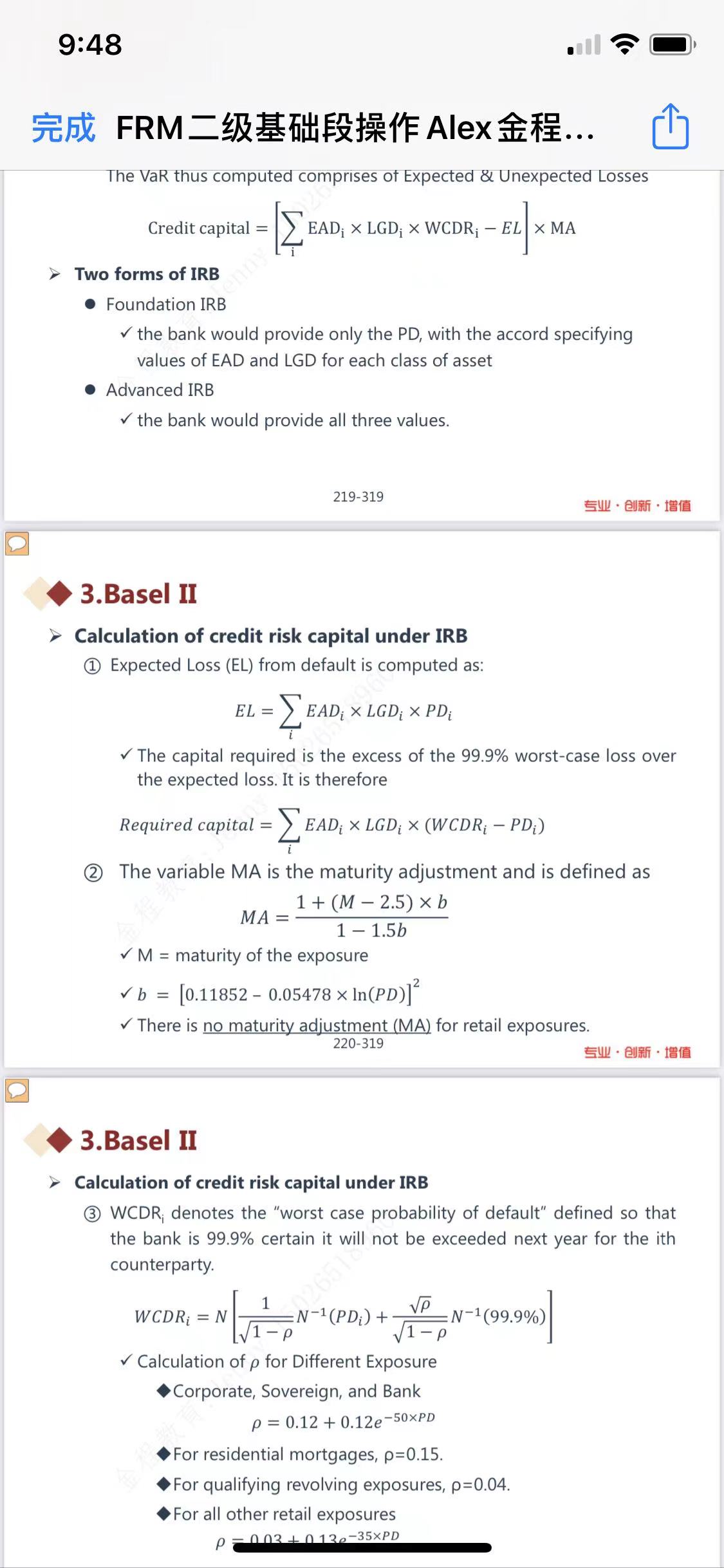 同学你好,公式见附图,都是讲义里面出现过的,在巴塞尔协议的Basel II用IRB法计量信用风险资本金那里。
