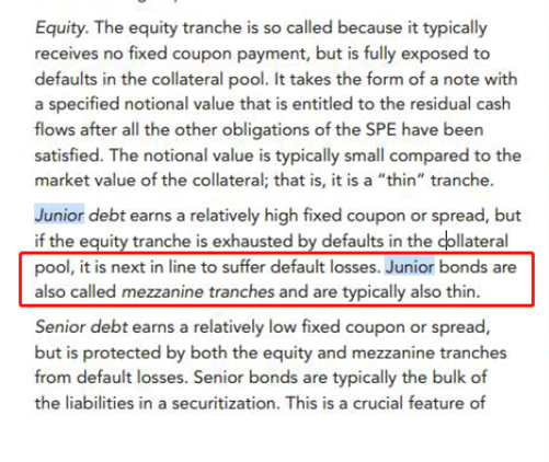 同学你好,粗略的看,mezz和junior确实是应该代表同样的一层的,所以在很多时候,中间层可以mezz和junior互用,但是如果严谨一点,mezz层级会比junior更安全一点,如果这两个层级同时出现的话,mezz应该是优先于junior层级的。这个时候你可以把它看作equity。这两个都是i原版书的说法。
