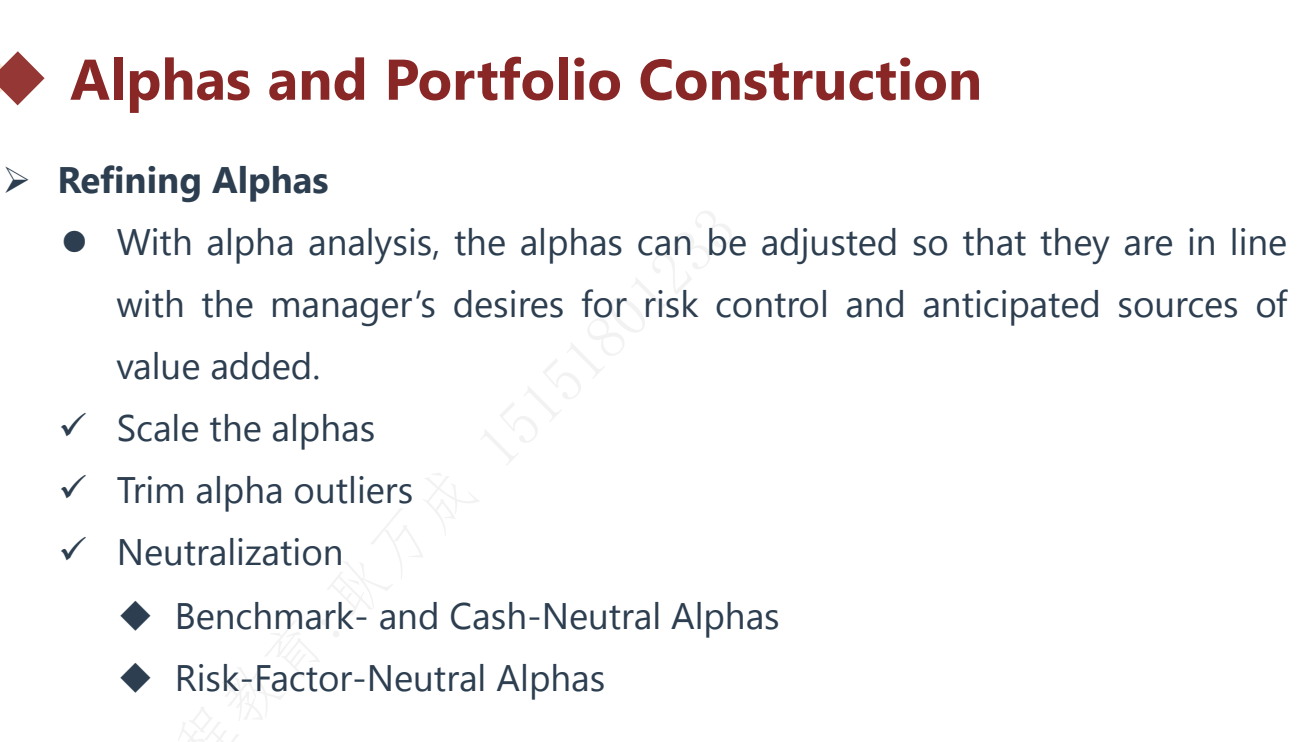 同学你好,alpha的精炼,其实是一些列过程,比如需要对alpha 进行量级的调整、在剔除异常值、最后中性化
