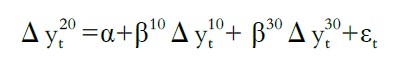 而双变量回归就是用两个自变量的变化来解释一个因变量的变化,这里用讲义中的例子来说明,假设做市商从客户手中购买或收到了流动性相对较差的20 年期的固定利率互换产品,收到互换的固定现金流,付出互换的浮动现金流,收到浮动利率的影响,所以需要对冲由此产生的利率风险。通常短期的互换交易比较活跃,但是20 年期互换产品的交易交易并不是特别活跃。如果直接用一个支付固定现金流的20 年期的互换做对冲虽然在理论上可行,但是在实际的交易市场上不太能够找到这类产品,因为它的流动性很差,交易不活跃。另外,流动性差的产品可能意味着有较大的买卖价差损失。所以,该做市商可以选择卖掉10 年期和30 年期互换产品的组合。因此,该做市商希望用一个双变量的回归模拟来描述20 年期互换利率和10 年期及30 年期互换利率的关系,如下图图二所示。