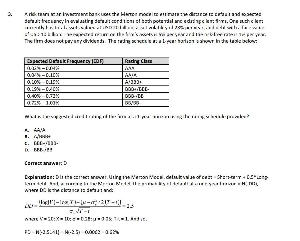 老師好,關於 merton model 的 distance to default 公式,我見到有兩條,不懂分甚麼時候用那一條公式,請指導。1. DD = (log v - log x +(u - (SD^2) / 2 )(T) / (SD * T^0.5)..................................................... 2. d2 = (Log (v / ke^-rt) / (SD * T^0.5) ) - (SD * T^0.5) / 2.................SD stand for standard deviation of asset value