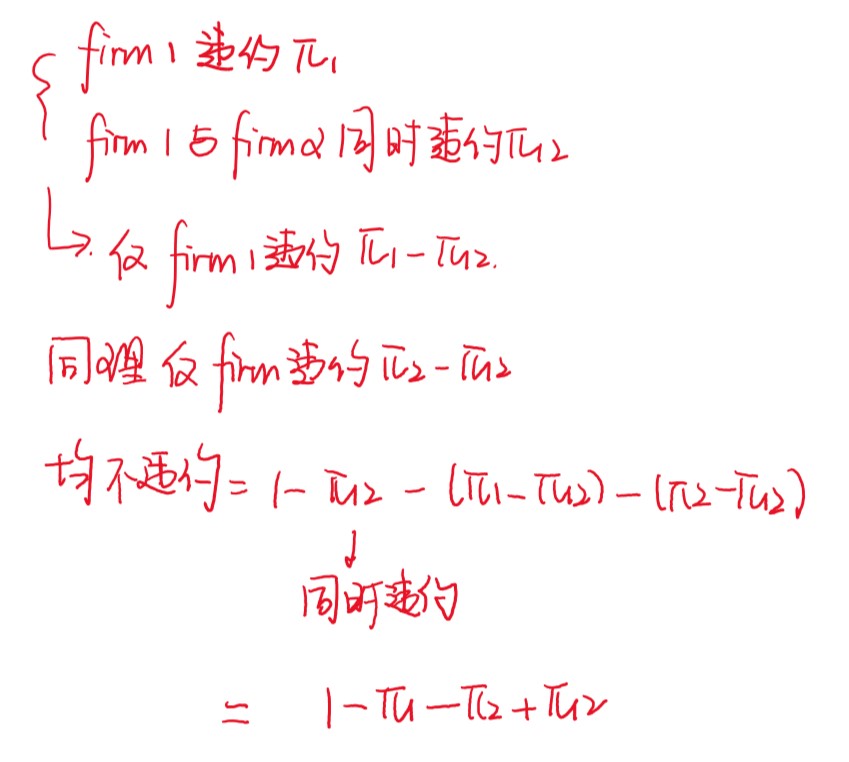 No default的概率是最后计算的,因为所有概率加总起来应该为100%。而仅firm 1违约(仅firm 2类似)应该用firm1所有违约的情况减去firm 1与firm 2同时违约的情况计算得出。如后图所示。