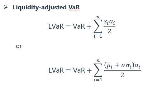 LVaR是在VaR的基础上加上cost of liquidation变现成本,所以是加上α*sigmai/2,VaR是用参数法来计算的,基于正态分布的假设,因为损失是在左边,所以用左边的分位点来表示,μ-z·σ,是减去的。
