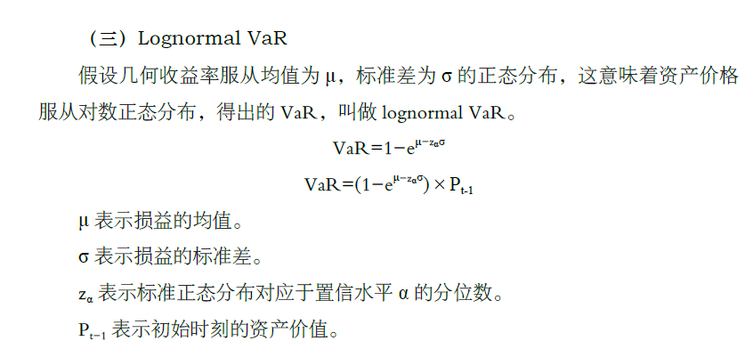 同学,你好,题目说了The daily return of this position is lognormally distributed with an estimated mean of 0.0% and volatility of 1.0%,该仓位的每日收益率呈对数分布,假设几何收益率服从均值为μ,标准差为σ 的正态分布,这意味着资产价格服从对数正态分布,得出的VaR,叫做lognormal VaR,就是使用的lognormal VaR。下图为推导: