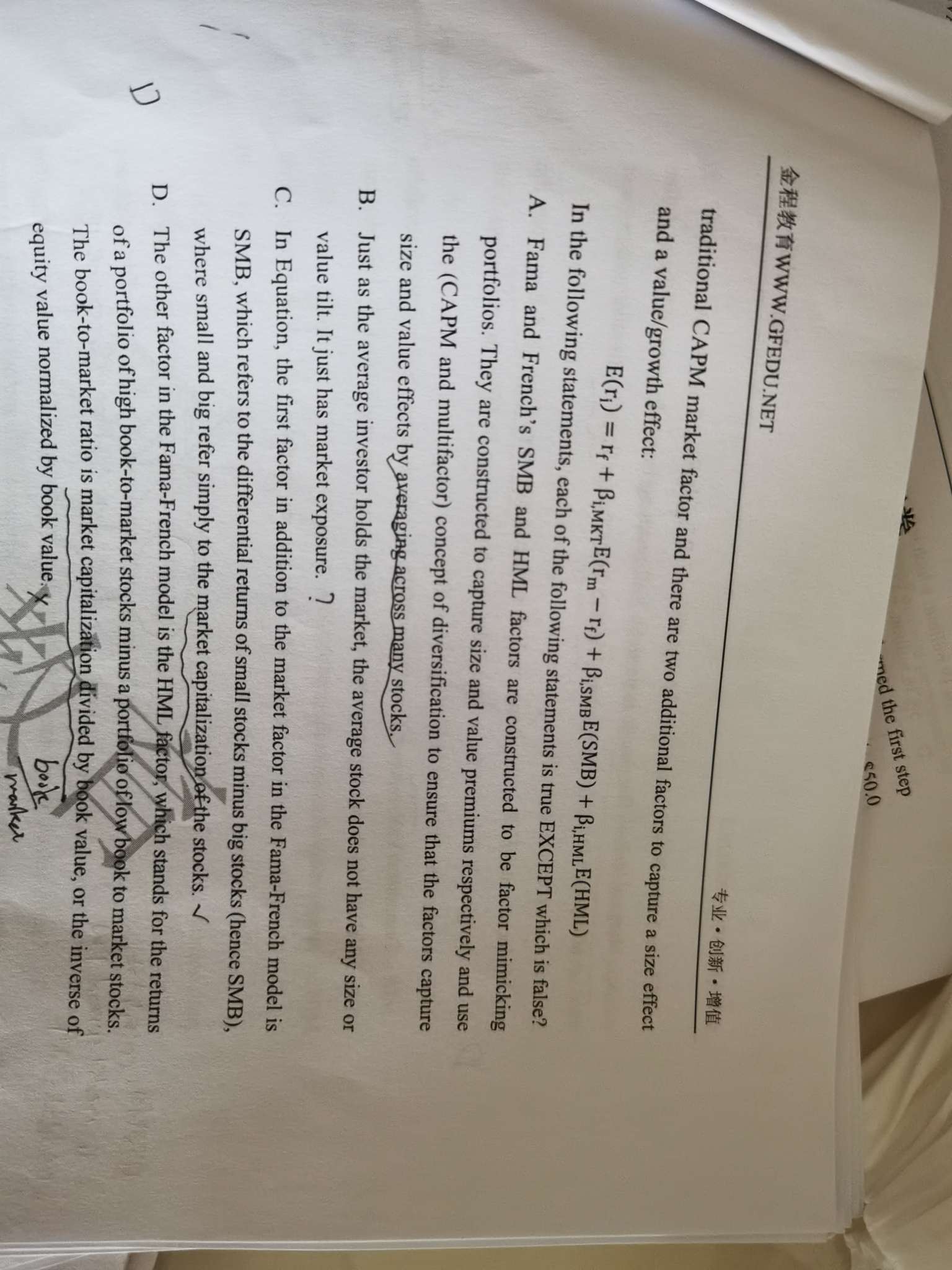 B:平均的投资者持有的是市场,average stock没有任何规模或价值倾斜。意思是大部分投资者(平均的投资者)持有的是大盘组合,无风险资产的加入只是来调风险的,所以这里实际在说fama公式中的CAPM,所以说没有任何规模或价值倾斜。【而后面两个因子才是规模或价值倾斜】。