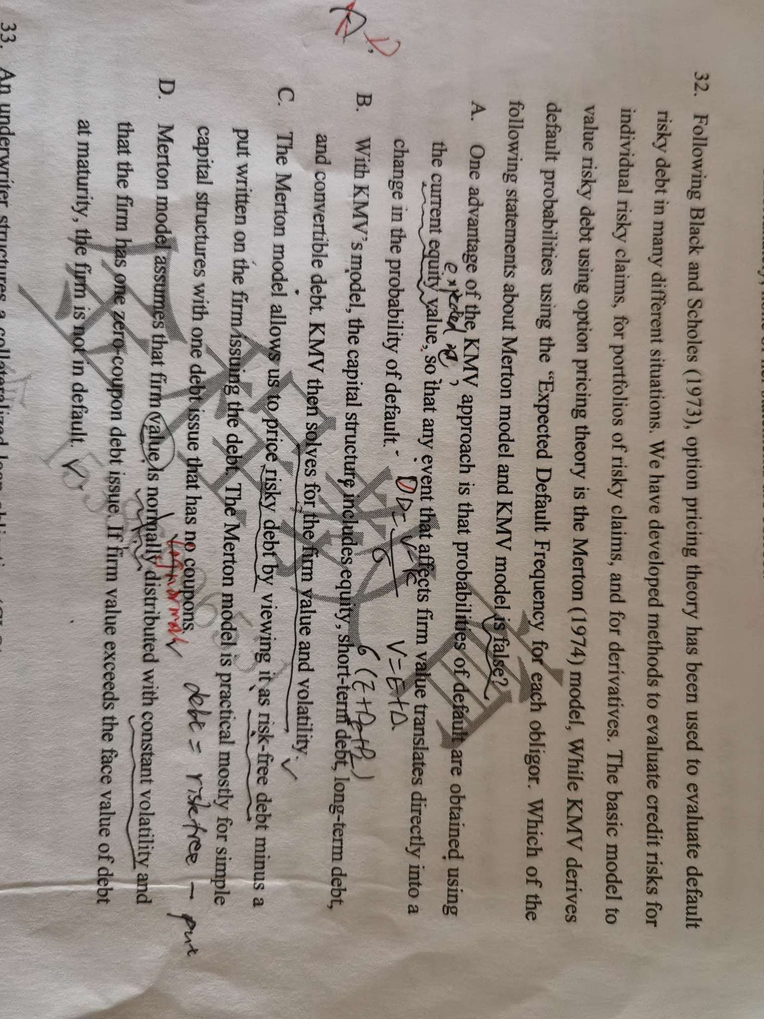 老师,密卷32题第一个选项中kmv中用current equity value对吗?我记得好像是expected value 呀。其他选项也都解释一下吧