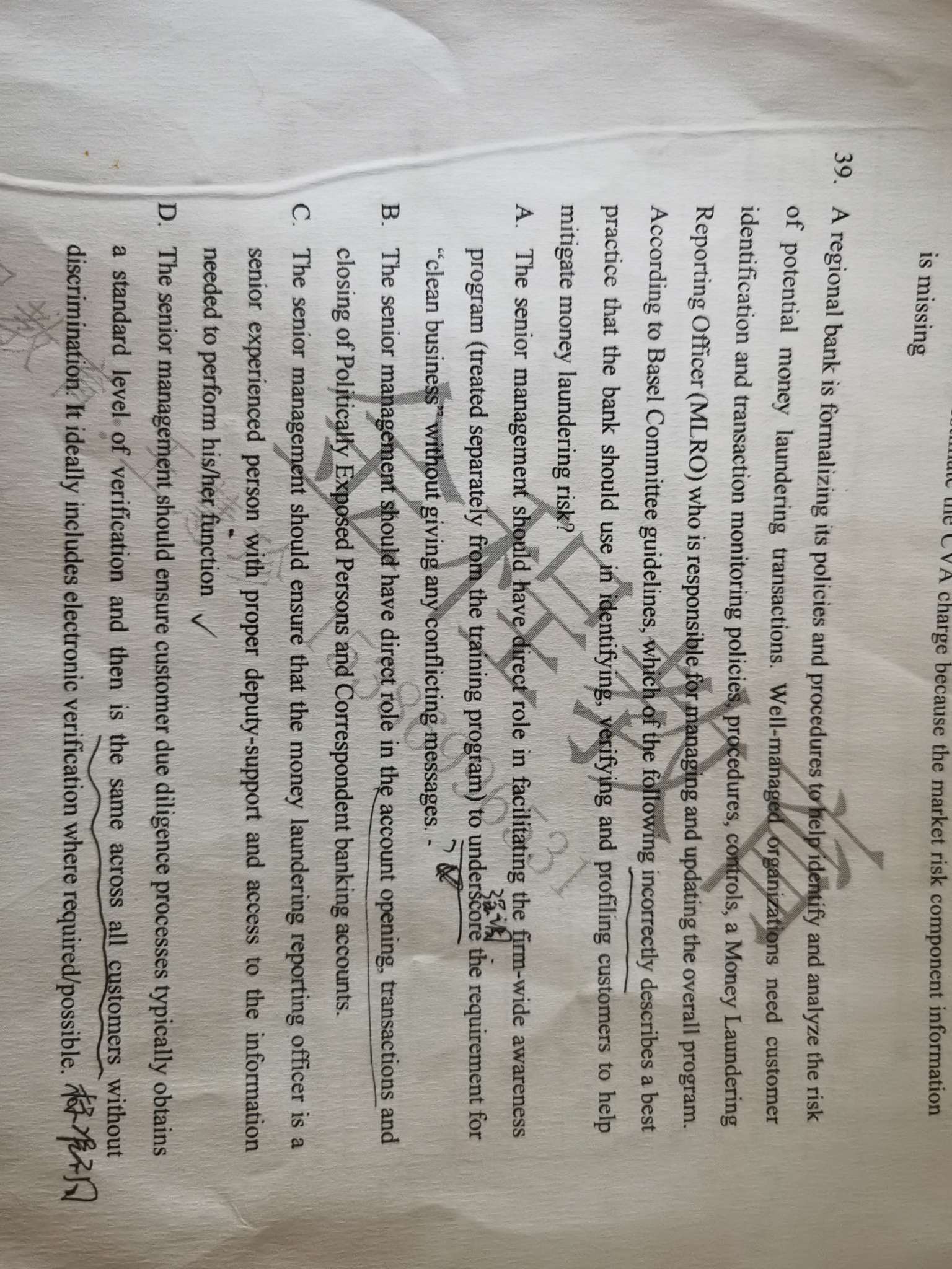 B选项说高管层要对那些政治高危人群的账户开户、交易、关闭等等流程负责,这里的说法没有问题,当然我觉得表述上其实可以更准确,不是have a direct role, 而应该是responsible for更准确。