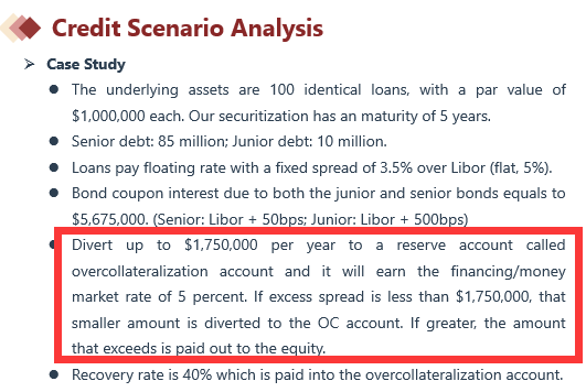 同学,你好,OC账户在题目没特别说明的情况下,可认为小于OCtrigger的金额给Equity,超过的金额给trust,但是这个case study它是给出了特定的条件,支付完senior和mez的金额,之后给到OC账户,满足之后有剩余给equity