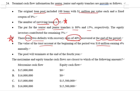 第24题,期末现金流分配时,为什么senior 和mezzanine只考虑本金?不是还有最后一期的利息收入吗?