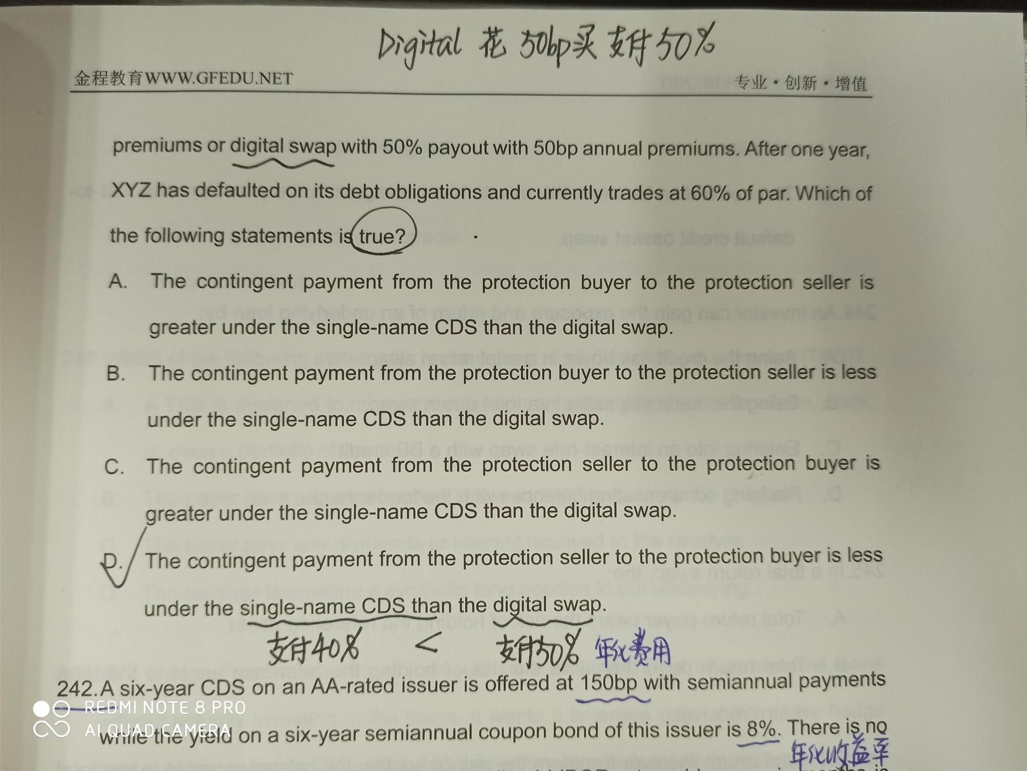 同学,你好,你别看题目这么长就觉得很难,抓住关键信息就很简单了,题目就是想要问sinle-name CDS和digital CDS谁最后能够赔到的钱多,题目说发生违约,损失是40%,那么sinle-name CDS赔40%,digital CDS赔50%,相比之下,sinle-name CDS赔的更少一些。