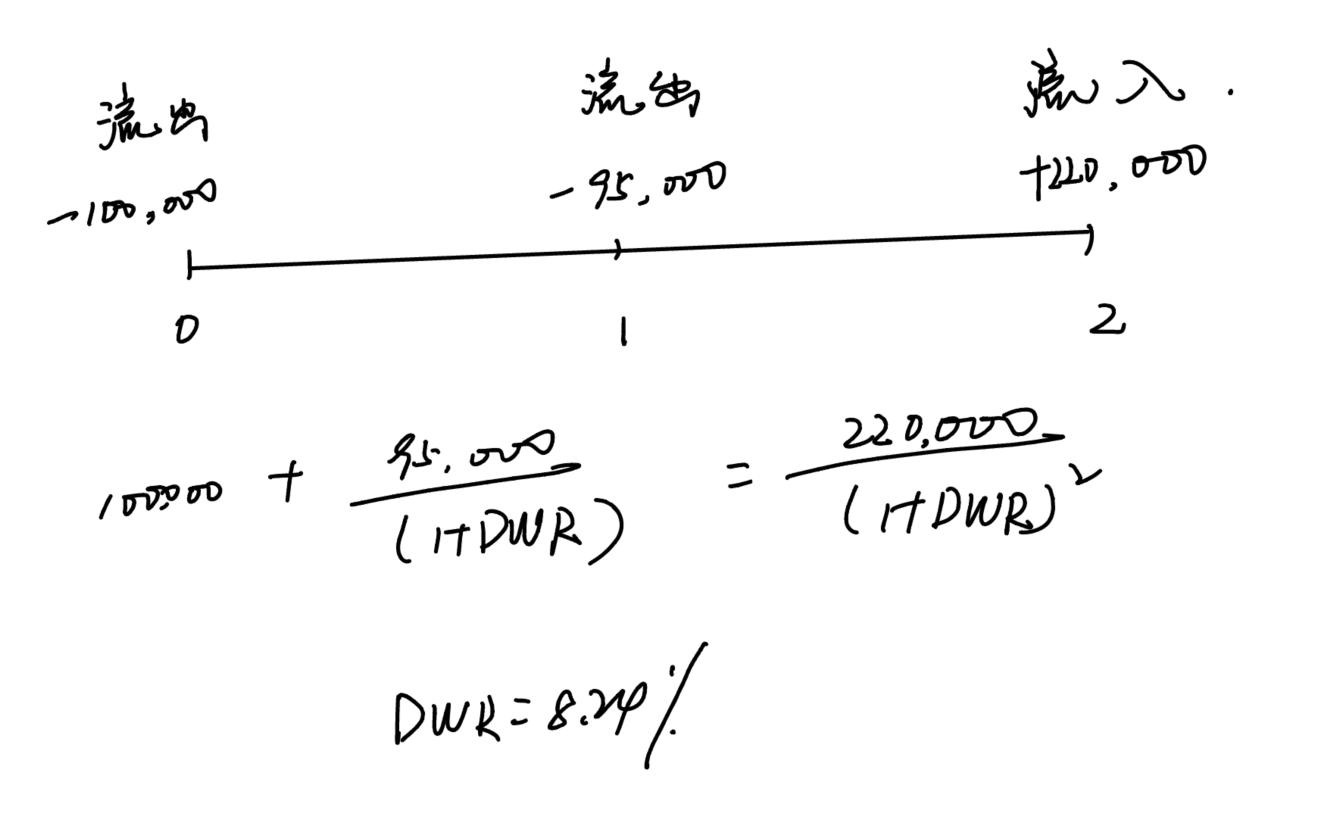 起初投资100000,1时刻追加投资95000,2时刻获得回报220000