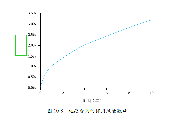 同学,你好,因为它的纵坐标是PFE潜在风险敞口,远期合约(Forward Contract),如远期利率协议和外汇远期,其特点是在合同到期日交割现金流(通常为一次性支付净额)。这意味着风险敞口是一个单调递增函数,反映出随着时间推移,最终合约价值的不确定性不断增加,远期合约的信用风险敞口随着到期日的临近而逐渐增加,如图10-8 所示