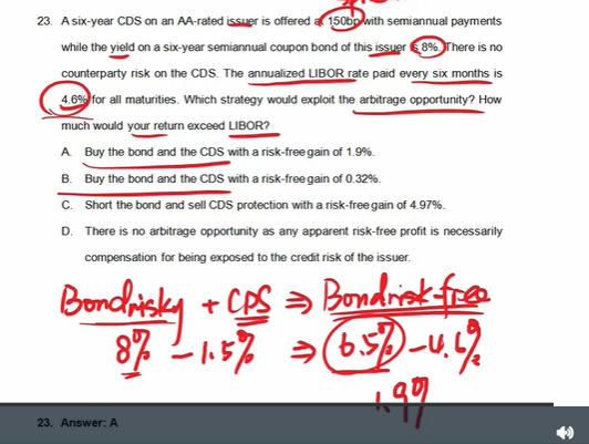 同学,你好,这道题目通过购买债券和CDS,能够得到无风险收益为1.9%。这是有套利机会的,所以D不对。买的债券和CDS不是同一个发行人的。