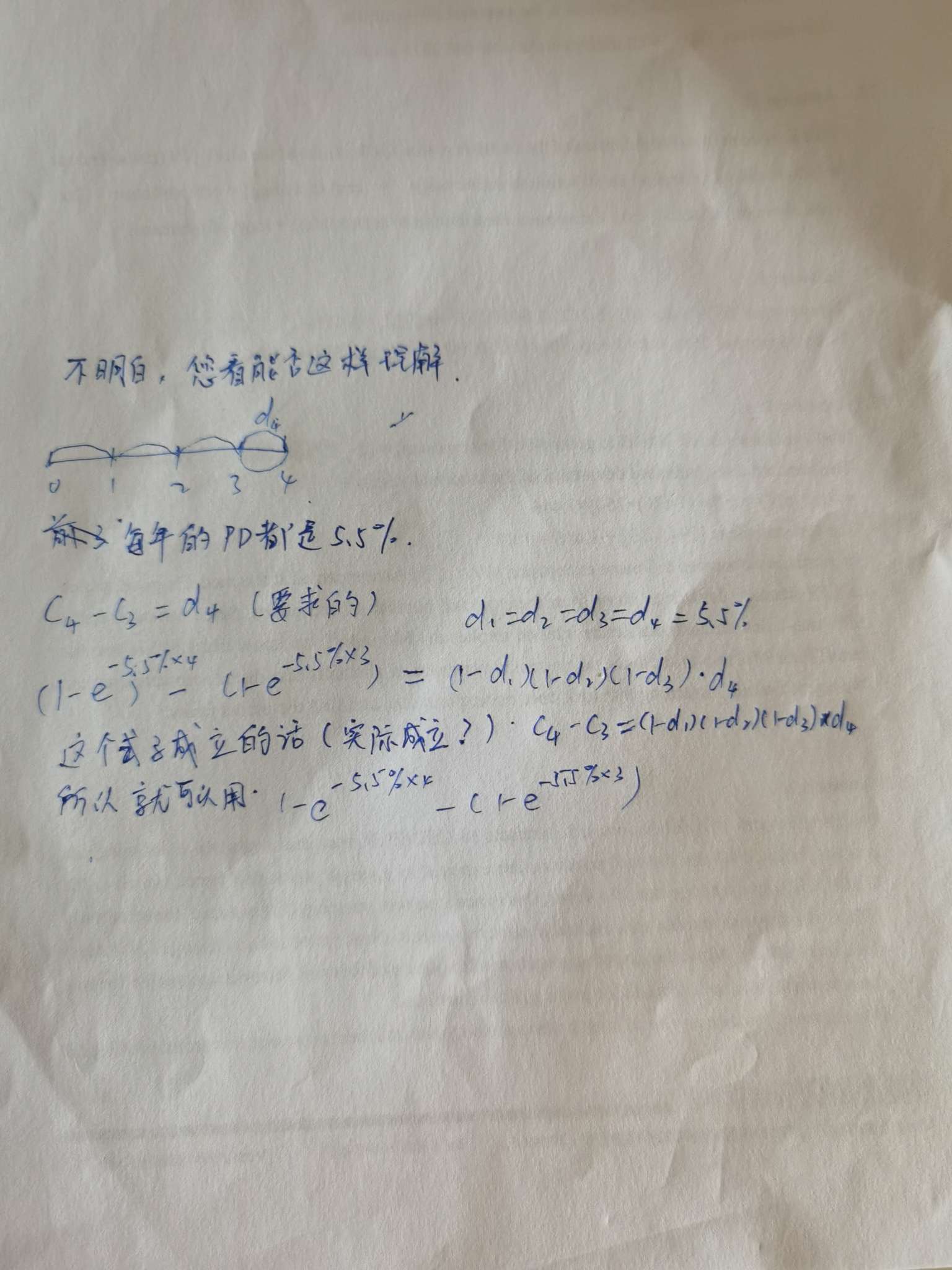 同学,你好,不能这么算哈,它是问第四年违约的概率,说明前三年没有违约,第四年才违约,指数分布算的话计算的是指计算每一段时间的违约情况,前三年不违约的概率是剔除违约概率后剩下的,不代表前三年不违约。