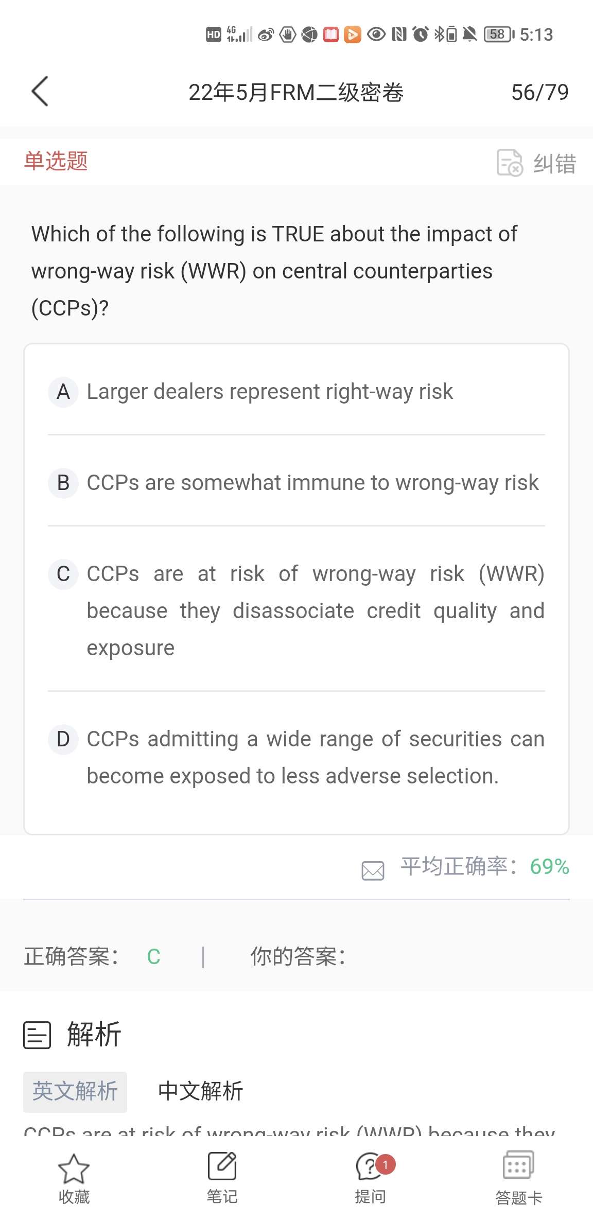 这道题考察的是在CCP的运行中WWR的特征。主要考察的是原版书关于这部分的结论。具体内容参见后附图片。选项A说Larger dealer体现出的是RWR,这个与原版书的结论是不相符的,应该是体现出的是WWR。B选项说CCP可以对WWR免疫这个也是与原版书结论不相符的,原版书的结论是CCP因为分开处理违约风险(通过准入门槛)和敞口变化(通过抵押品和保证金要求)所以容易忽视WWR。同理,C选项是正确的。关于D选项,CCP的运作中是比较容易出现因信息不对称而产生的逆向选择的,主要是因为参与交易的交易商对交易的了解程度比CCP更深,而接受多种交易/抵押品并不能缓解这个风险。