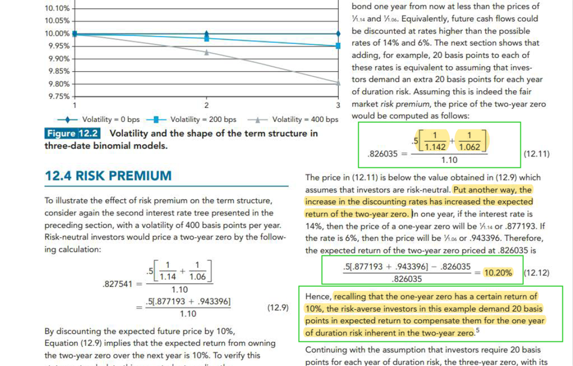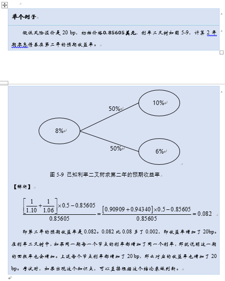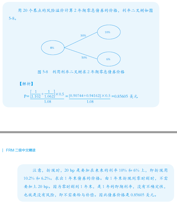 同学,你好,这里你要结合前面的讲解理解,这里只是换了一种思路验证risk premium,在视频讲解中,上一个例子就是把risk premium加到折现率上进行计算的,然后接着就讲到risk prumium的验证(即你问的这个例子),只是换了一种思路而已,在这个例子,通过计算第2年的预期收益率(2年末期末价格减去1年末期初价格)/1年末期初价格,这里1年末期初的价格0.85605是经过折现率(+risk premium)调整的,看第1张图计算过程,发现计算出来是8.2%,比8%多了0.2%,这部分就是risk premium,在利率二叉树中,如果同一期每一个节点的利率都增加了同一个利率,那就说明这一期的回报率也会增加。上述每个节点利率都增加了20 bp,那么对应的收益率也增加了20 bp。也就是证明了折现率的提高,增加了当期的预期回报。给你截取了原版书的讲述,讲的也是一样的道理哦~
