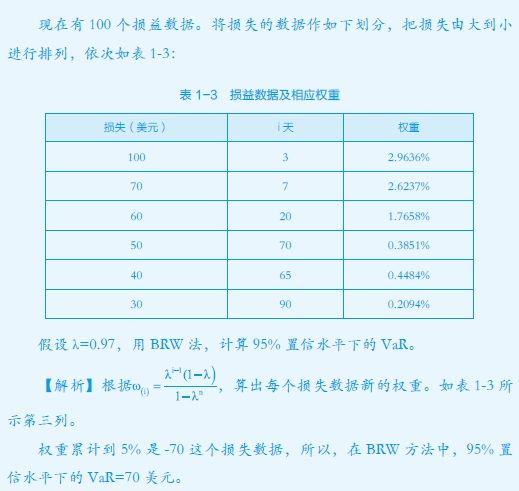 同学,你好,不是看权重的分位数,我们依旧还是按照损失的大小进行排序,然后根据损失大小排序好的顺序,将每一个损失对应的权重也计算好,然后我们是按照权重进行累积,假设在95%的置信水平下,那么就按照权重累积5%,排在5%位置上的损失数值就是对应的VaR,给你举个例子说明一下:看下图