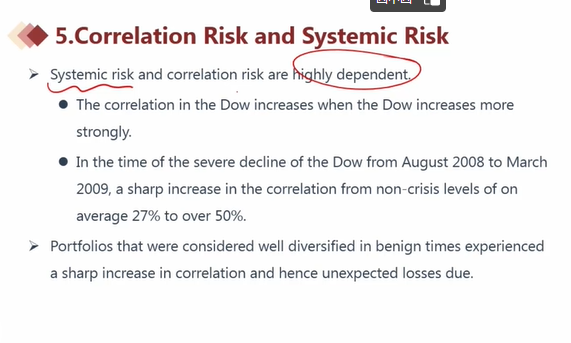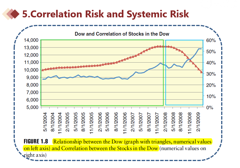 同学,你好,这句话是描述的下面这个图,道琼斯指数是蓝色的三角线,道琼斯的相关系数是蓝色的线。在2008 年3 月之前,道琼斯指数上涨时,相关系数也在上涨。在2008 年3 月之后,相关系数上涨时,道琼斯指数是下跌的。当相关系数出现剧烈上涨时,预示着市场系统性风险增加,但注意的是一定是剧烈增长或快速增长,这种情况说明了系统性风险和相关系数风险高度依赖。