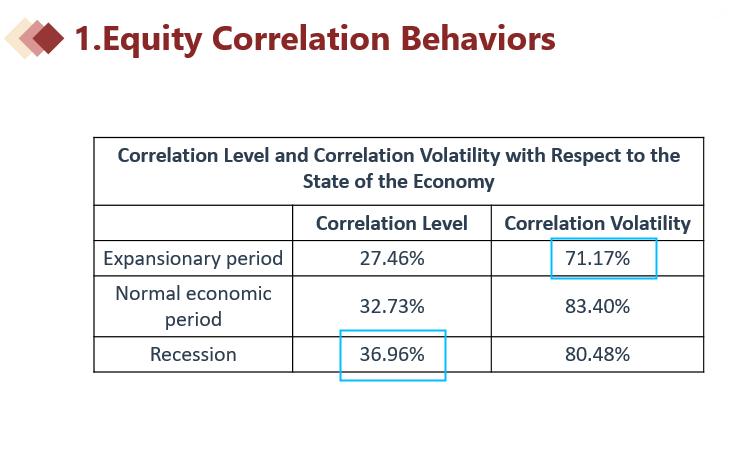 老师,前面讲到经济衰退时相关系数较高,后面又说每一次衰退前相关系数的波动又是减少。到底是怎么样的规律?