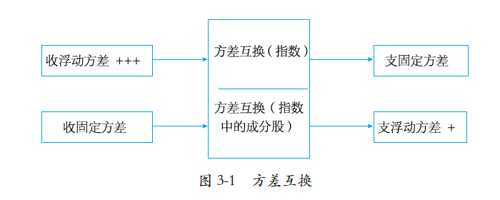 当相关系数上涨时,波动率会上涨,方差也会上涨。这个策略会涉及两个互换。首先,在第一个方差互换中支付固定方差(同时收到浮动方差),这是基于一个指数。其次,在第二个方差互换中收取固定方差(同时付出浮动方差),这是基于这个指数中的成分股,如图3-1。