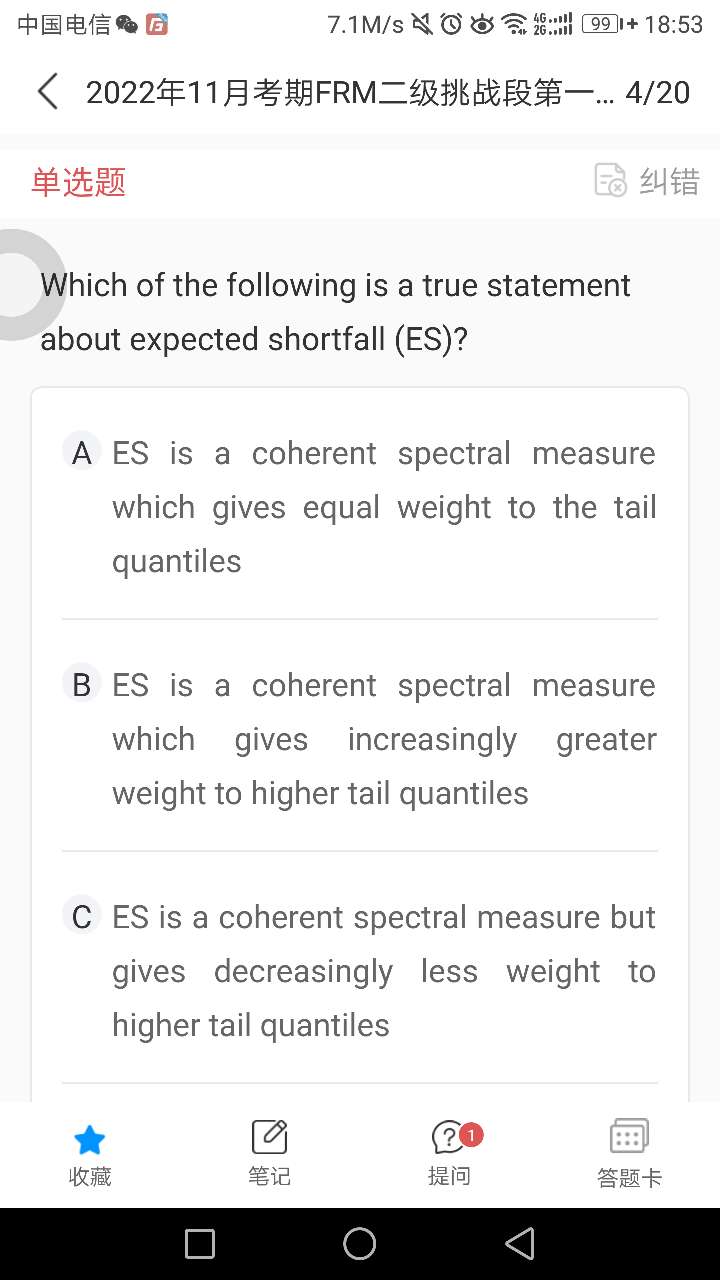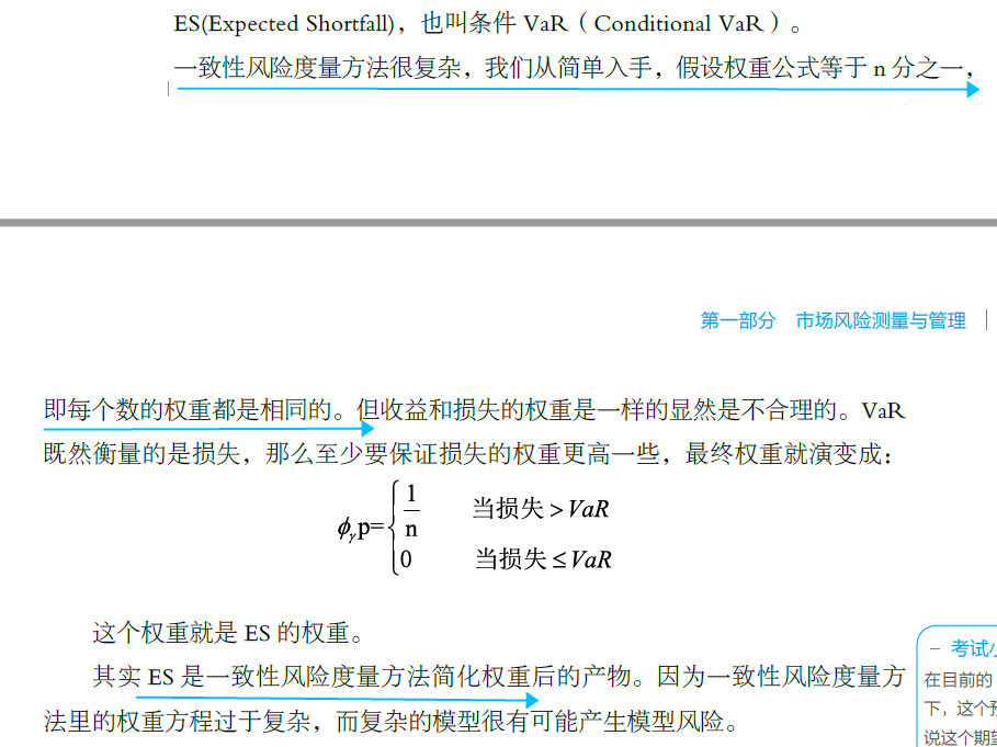 同学,你好,ES是一致性风险度量里最简单的形式,就是对于尾部数据进行等权重平均,所以这道题目ES说是等权重形式的。但是说到一致性风险度量时,就会有很多种权重计算形式。