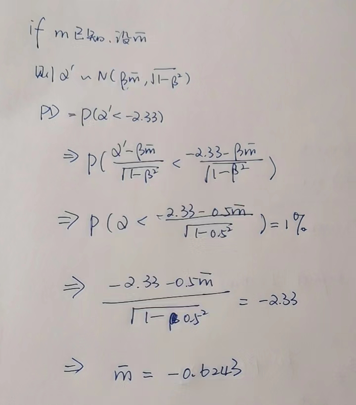 这道题考察的是单因素模型,其中correlation to the market factor就是beta。realized market value指的就是一个确定的市场因子的取值。也就是说考察的是当市场因子m给定某个值时,可以计算出违约概率是1%(default threshold at the 99% confidence level),问这个m取值是多少。在这道题中给定的违约临界值对应的概率是1%,所以合理假设计算非条件违约概率时分位点就是-2.33。在这个基础上要计算当m给定情况下违约概率仍是1%,所以需要采用条件违约概率计算的公式(即m为条件)。具体计算详见附图。