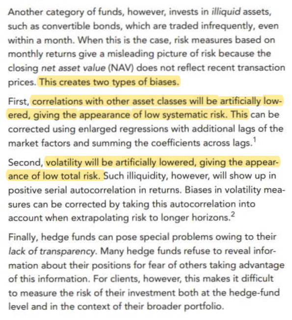 首先,与其他资产类别的相关性将被人为地降低,呈现出低系统风险的特征。这可以通过使用市场因素的附加滞后的放大回归和对滞后系数的求和来修正。