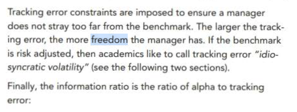 同学你好,根据原版书定义,跟踪误差限制是为了确保经理不要过多的偏离基准,那么跟踪误差越大,说明可以偏离的范围越广,自由度越大。