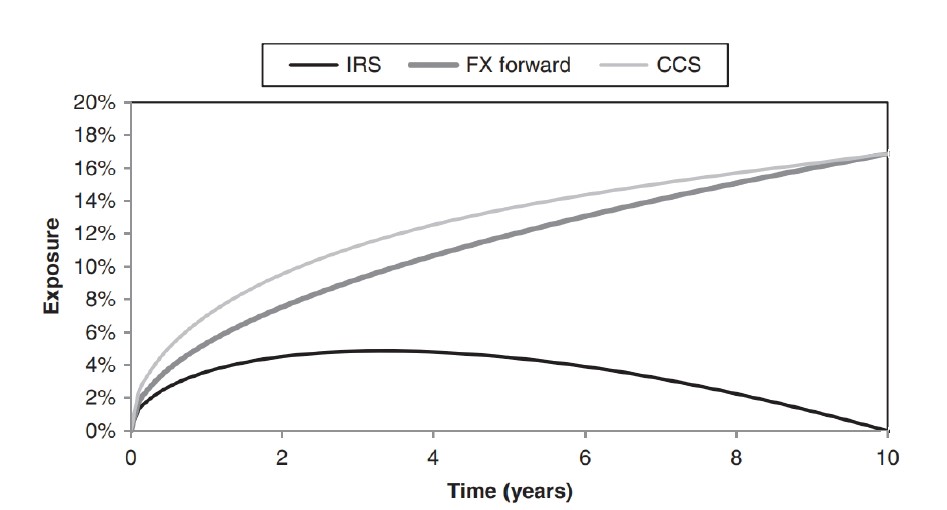 同学你好,我们可以看下面这个对比图,很明显利率互换和外汇远期的风险敞口都是随时间不断上升的,因此期间不会存在一个最大的敞口。
