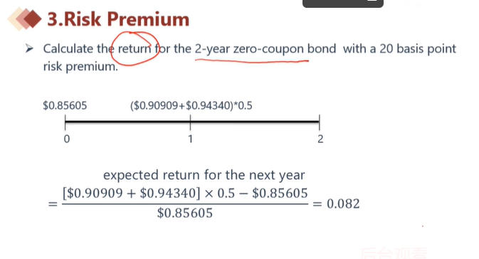 ppt170页,3 risk premium的第二页,计算的return应该是0—1期间的吧?感觉老师讲的有点问题,0.90909,0.94340都是直接用10%、6%折现的数,没有考虑风险溢价了呀,我理解是不是算0-1的期望收益,用1时点价值和0时点价值差异来算,此时1时点价值就是站在1时点6%和10%都是确定的spot rate了?