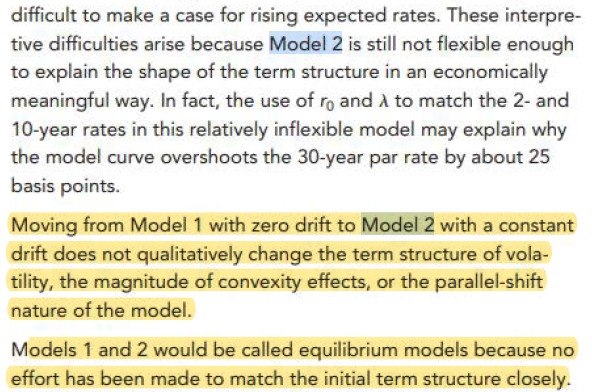 同学你好,模型2是一个均衡的模型,不是一个无套利模型,因为仅增加在模型1 上增加一个固定的趋势项得到模型2 既不会影响波动率期限结构的形状也不会影响模型的平行移动的特征,增加一个随时间变动的趋势项也不会改变这些特征。