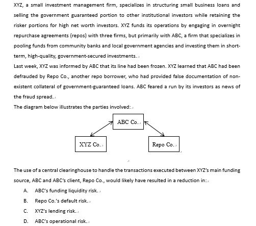 C不正确。在这种情况下使用清算所也不会减少XYZ的借贷风险。
